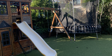 Outside, the home continues to impress with a generous backyard featuring a sparkling outdoor pool, an inviting alfresco area, and a dedicated children’s play zone with a cubby house, slide, swings, and a trampoline set on lush artificial turf. The rear space is ideal for family, lifestyle, or commercial shoots needing a playful or relaxed setting.