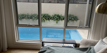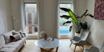 The ground floor is available for all shoots and includes a striking open-plan kitchen with a large marble island bench, pendant lighting, integrated appliances, and brass-accented bar stools. Adjacent is a spacious dining area, a relaxed lounge room with pool views, a cosy living space, a sleek powder room, and a stylish office nook. The interiors are refined and understated, providing a versatile canvas for a wide range of creative briefs.