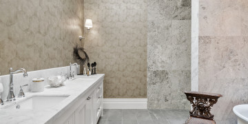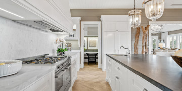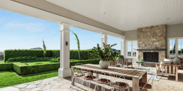 The interiors are warm yet palatial, defined by vaulted timber-lined ceilings, herringbone oak floors, and a calming Hamptons palette. The grandeur of the home is matched by its functionality, with a formal reception hall, expansive living and dining areas anchored by a roaring open fireplace, and a gourmet kitchen that marries luxury and performance with Ilve, Miele and Carrara marble finishes. French doors open onto a generous covered terrace with Castlemaine stone paving, a built-in BBQ, and an outdoor fireplace — all perfectly positioned to overlook the gardens and Hanging Rock in the distance.