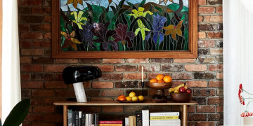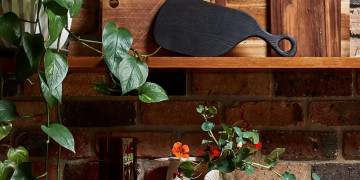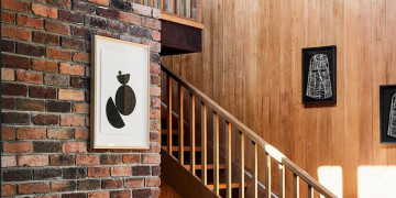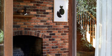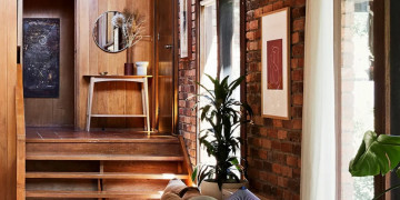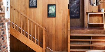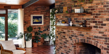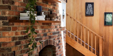 The light-filled split-level living zone centres around a dramatic double brick open fireplace, leading up to a mezzanine library and reading nook via a feature timber staircase. The kitchen retains its authentic charm with timber cabinetry, terracotta bench tops, open shelving and a low breakfast bar, flowing into a dining area with a second fireplace, skylight, stained glass detail and access to the courtyard and rear deck. Three character filled bedrooms offer a mix of timber panelling, exposed brickwork and floor-to-ceiling glass.