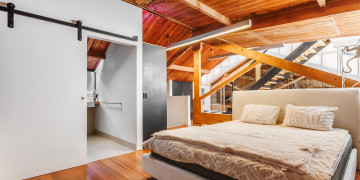 The upstairs bedroom continues the visual story with exposed rafters, soft lighting, and textural bedding. The entire apartment is bathed in natural light from multiple skylights and window lines, ideal for daylight-controlled shoots or elevated lifestyle content.