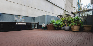 Outside, a private rooftop terrace provides a separate outdoor lounge space with timber decking, covered cabana seating, and soft urban ambience—perfect for talent holding, alfresco content, or golden hour wrap moments.