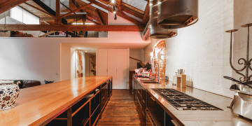 Inside, you’ll find a soaring cathedral ceiling with exposed timber trusses, expansive open-plan layout, and polished hardwood floors throughout. The centrepiece is an industrial-inspired kitchen featuring stainless steel benchtops, high-end appliances, and bold ventilation ducts—set against an exposed brick arch with warm mood lighting. A long timber island bench offers room for styling, prep, or collaborative workspace.