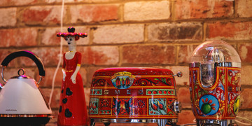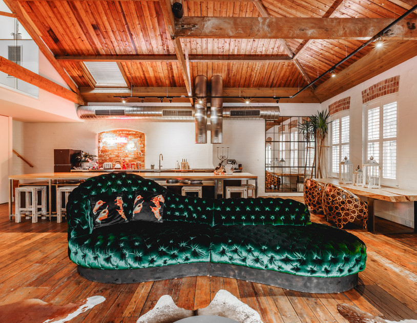 The lounge and dining zone blends sophistication and play with a deep emerald green velvet couch, natural timber furnishings, and eclectic decorative accents, all backed by whitewashed walls and original brickwork. It’s a highly photogenic space that adapts to a wide variety of shoot styles, from fashion to content creation.
