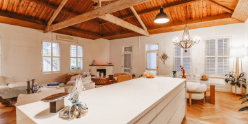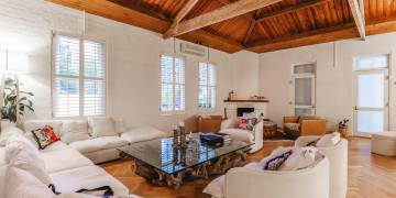 Step inside to discover a double-height living area with herringbone timber flooring, an inviting fireplace, and a curated mix of vintage and contemporary furnishings—including velvet occasional chairs, a driftwood glass coffee table, and soft neutral tones that photograph beautifully.