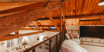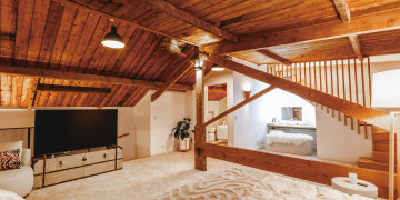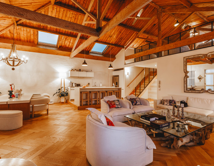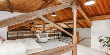 The bedroom is a standout, showcasing exposed timber beams, a pitched ceiling, and glowing mood lighting—perfect for capturing intimate lifestyle moments or stylised fashion content. A separate work nook and makeup corner adds functional appeal for longer or crew-driven shoots.