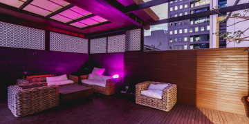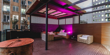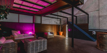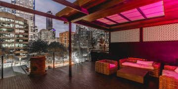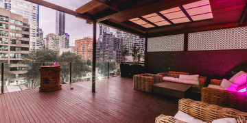 The rooftop terrace offers private outdoor lounge space, with timber decking, architectural screening, and ambient lighting, giving productions both contrast and versatility.