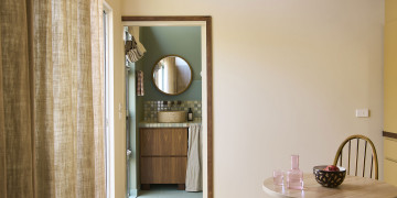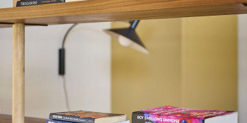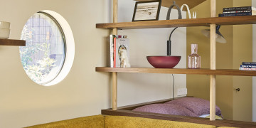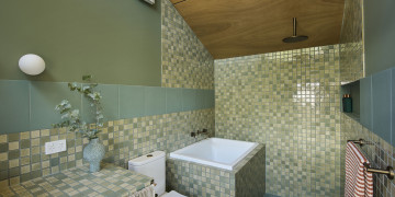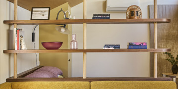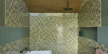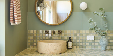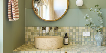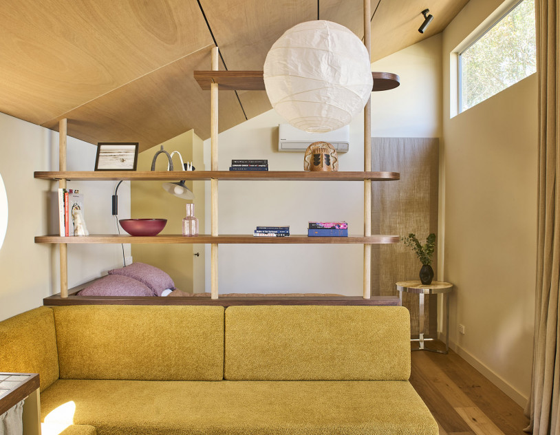 A custom floor-to-ceiling bookshelf elegantly divides the bedroom from the main zone, while the show-stopping green-tiled bathroom brings a bold pop of colour. Every window frames leafy views of gum trees and opens onto a private garden and deck, complete with an outdoor shower for that dreamy coastal feel.