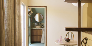 The Love Shack is a modern beachside studio with a warm mid-century soul. Newly built in 2024, the space features a soaring pitched ceiling and a calming, neutral palette throughout. Designed for both style and comfort, the layout includes a compact kitchenette, built-in bench seat, and dining table within the light-filled living area.