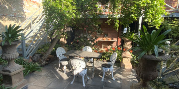 The vibrant living room draws attention with its bold orange seating, creating a dynamic contrast against the home’s elegant details. Intricate ceiling designs and a carefully curated cabinet of antiques infuse the space with character and charm. Outside, the recently landscaped, lush backyard offers a peaceful green escape, perfect for outdoor scenes.