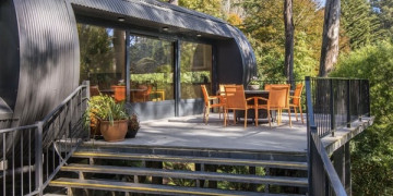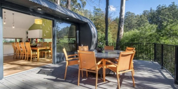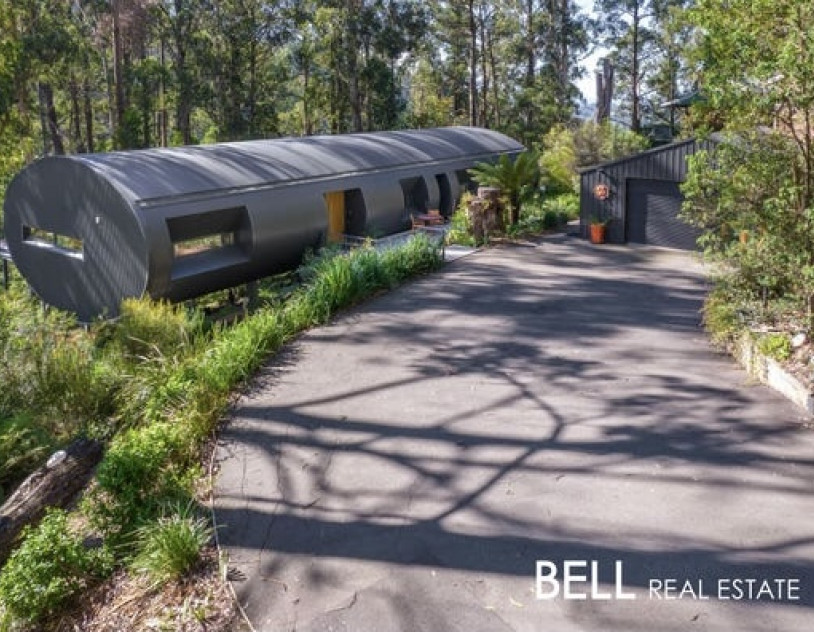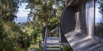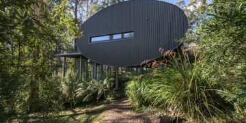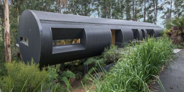The structure is unlike anything else in the Victorian hills. A curved barrel vault steel form elevated on stilts above a sloping 1.5 acre block, the building sits within the landscape rather than on top of it, surrounded by manicured native vegetation and garden art that blur the boundary between architecture and environment.