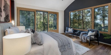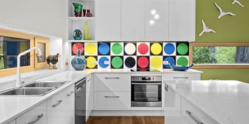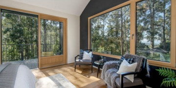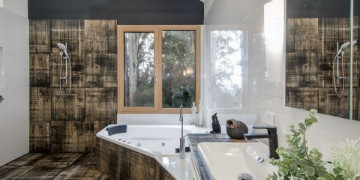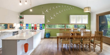 Inside, the arched ceilings follow the organic curve of the exterior, creating a warm and flowing interior space. Timber floors, floor to ceiling glazing and a natural palette of sage, warm white and timber connect every room directly to the forest beyond. The kitchen is characterful and considered, with a colourful geometric splashback and island bench sitting beneath the sweep of the roofline. Light moves through the canopy and across the interior throughout the day, shifting the mood of every space without any intervention.