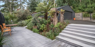 Elevated decks extend into the treetops at multiple levels, offering quiet outdoor spaces framed entirely by native bush. The property sits on 1.5 acres and the seclusion is genuine.