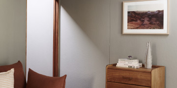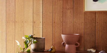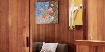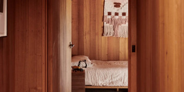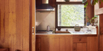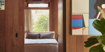 The living room features clerestory windows on all four sides, where the ever-changing natural light and shadows dance across the walls during the day and at night you can see the stars and moonlight flooding in. The moment you walk in you feel a sense of calm with the beautiful use of timber, cork floors and French Green painted walls. The interiors have been applied with flair, with a selection of complementary mid-century furniture and art enhancing the home’s warm and welcoming atmosphere. This beautifully curated location is a perfectly original backdrop to complement your next creative project.