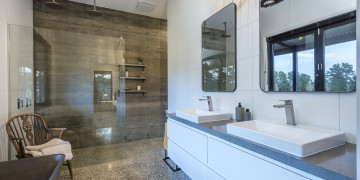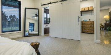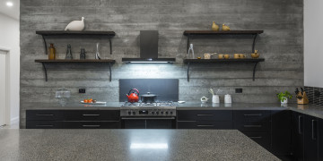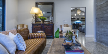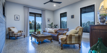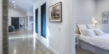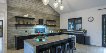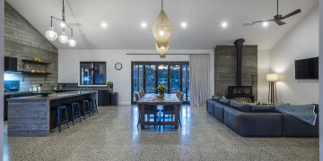 Step into a realm of refined industrial warmth. Polished concrete floors, raw concrete walls, and soaring vaulted ceilings create a striking aesthetic. Expansive floor-to-ceiling windows flood the space with natural light, offering views of the outdoor entertaining and pool area. Sleek bespoke fittings add warmth and texture.