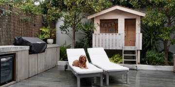 Step outside to discover a built-in BBQ and a delightful tree house, making it a fantastic setting for family gatherings and children's photoshoots. The home features high ceilings throughout, with a neutral palette complemented by blonde wooden floorboards.