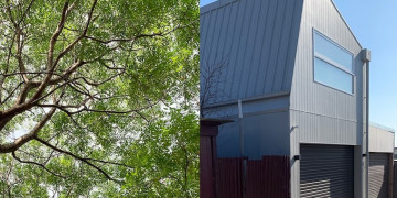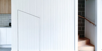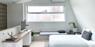 The adjoining Studio sits at the rear of the garden and can be hired separately or with the main house. Designed as a versatile creative space, it features a peaked ceiling, concrete floors, white panel and besser brick walls, and aluminium doors that open onto the courtyard. With its own kitchen, bathroom, laundry, and flexible setup, the studio is ideal for product shoots, food photography, workshops, or small events.