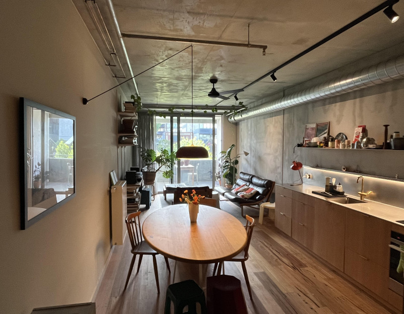 Part of the award winning Nightingale Village development, designed by Clare Cousins Architects, this amazingly contemporary flat features concrete walls, high concrete ceilings, recycled timber floors and kitchen, stainless steel bench top, indoor plants, terrazzo bathroom, ceiling fans and linen curtains. With its neutral decor, it is a great blank canvas for creatives to bring their next project to life, whether that be a photoshoots or TV commercial.