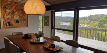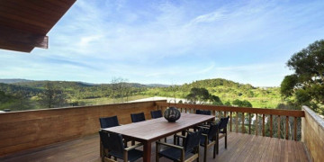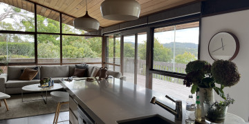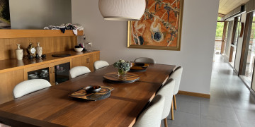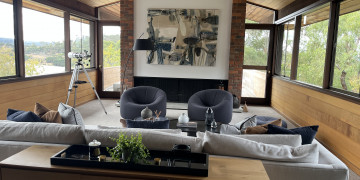 This modernised 1980s residence provides an ideal backdrop for productions and events, featuring versatile interiors that combine warmth and sophistication. Highlights include timber finishes, soaring ceilings, and expansive windows that bathe the home in natural light, framing panoramic views of the rolling hills and greenery beyond. A private bar with rich brick and wood detailing adds a unique and atmospheric setting for film shoots or intimate gatherings.