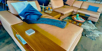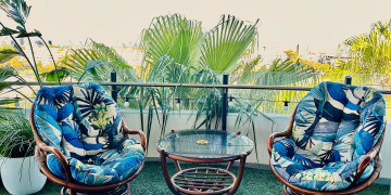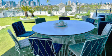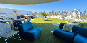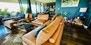 Inside, the sweeping curved architecture, rich teak furnishings, and a refined blue-green palette pay homage to the iconic design of the 1950s–1970s. Expansive floor-to-ceiling windows flood the space with natural light, while the Palm Springs-inspired terrace, styled with vibrant outdoor touches and a Slim Aarons aesthetic, sets the tone for elevated shoots and private launches. Spanning 280 sqm, including 135 sqm of outdoor space, the penthouse features three bedrooms, an office nook, two bathrooms, a powder room, and easy lift access, offering versatility, luxury, and an unparalleled creative setting.