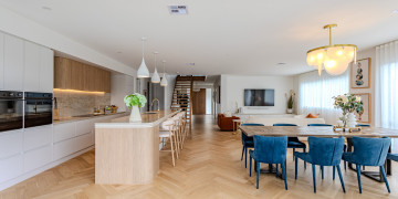 Inside, soaring ceilings, chevron oak floors, and a wide entrance hall set the stage for dramatic openings. The open-plan living and dining zone showcases a showpiece kitchen with porcelain stone benchtops, curved cabinetry, integrated appliances, double ovens, and LED highlights. A private media room, executive study, and adjoining butler’s pantry with cocktail servery windows provide versatile options for filming and activations.