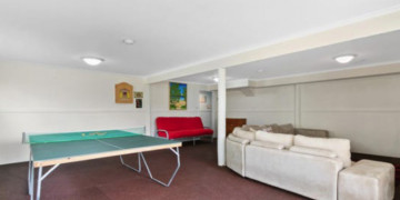 The downstairs area is a spacious, open-plan layout, perfect for filming or staging equipment. It features a modular sofa, a TV, a table tennis setup, and an additional toilet and sink. The layout is flexible, catering to a variety of production setups.