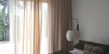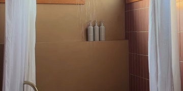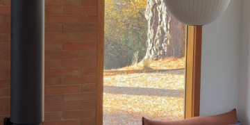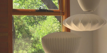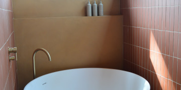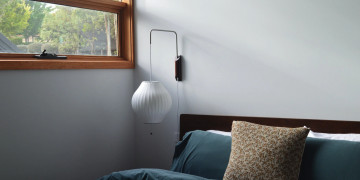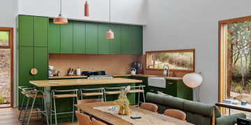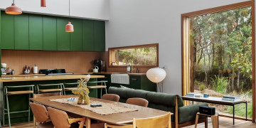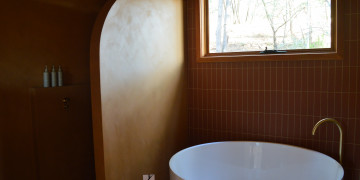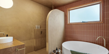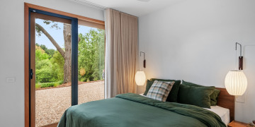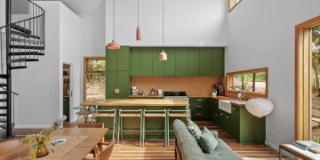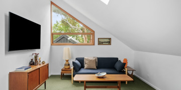 Natural light floods the interiors, highlighting clean architectural lines and thoughtful design details. The Retreat boasts a sunken conversation pit with fireplace and original George Nelson Bubble lights, while both bathrooms showcase micro cement finishes, natural terracotta tiles, and round soaker bathtubs. Playful design moments abound, from an olive-green kitchen to green wool carpet in the loft.