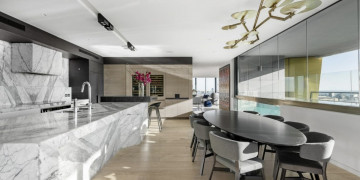 The penthouse, recently featured in Belle Magazine’s Smart Spaces, is a masterclass in high-end design, offering a meticulously curated space with bespoke joinery, custom lighting, fine timbers, and architectural finishes. A stunning marble kitchen and open-plan living area, framed by floor-to-ceiling glass, overlooks a private plunge pool, providing a showstopping setting for both still and motion capture. The fully equipped butler’s pantry and gourmet kitchen boast top-tier Miele and Subzero appliances, ensuring an elevated hospitality experience for exclusive events and activations.