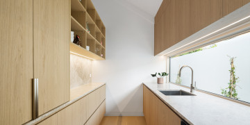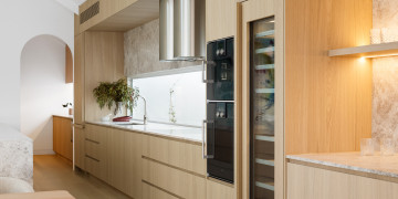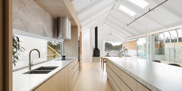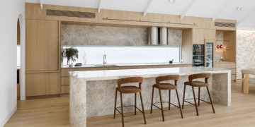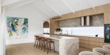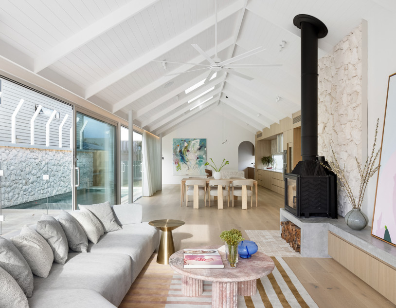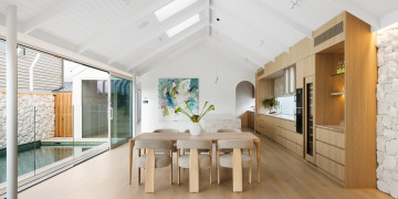 Inside, vast glazing, floating corner doors, and skylights invite natural light to dance across soaring timber lined ceilings and French Oak floors—ideal for capturing depth, movement, and atmosphere. The open-plan living area flows seamlessly from a Gaggenau-appointed chef’s kitchen with travertine island and butler’s pantry to a sun drenched north facing terrace, complete with heated pool, spa, BBQ, and pizza oven overlooking the treetops.