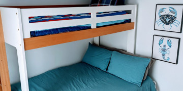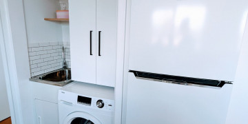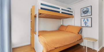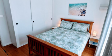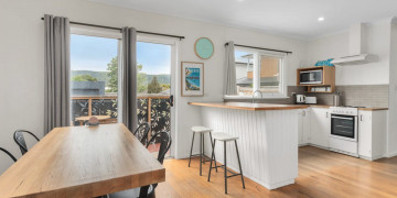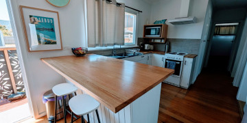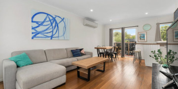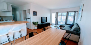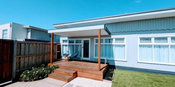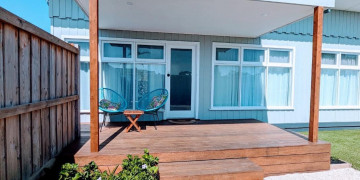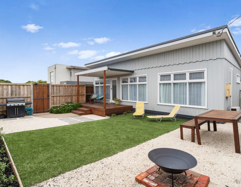 Featuring 2 well-appointed bedrooms and 2 stylish bathrooms, the home boasts light-filled spaces and a relaxed, open-plan layout. The kitchen and dining area are ideal for cozy meals or entertaining, while the inviting living room provides a serene retreat after a day at the beach. The outdoor area includes a private backyard with a BBQ setup, lush artificial turf, and comfortable seating for capturing shots enjoying the coastal breeze.