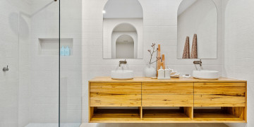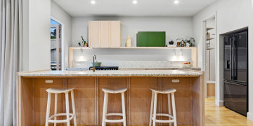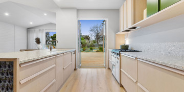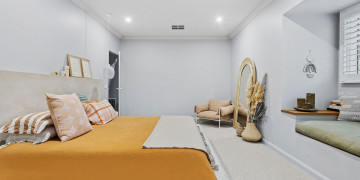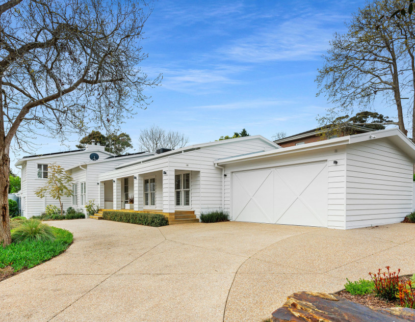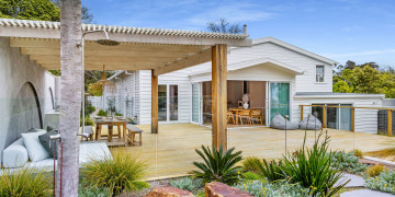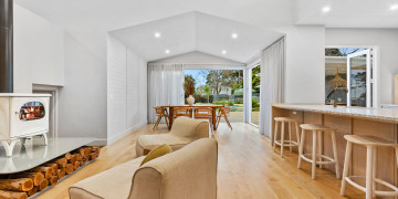 This stunning Hamptons-style seaside location with sea views is a modern oasis. The living and kitchen area opens up to a beautiful alfresco space featuring decks, a magnesium pool, a Swedish sauna, and a gorgeous native garden with a Palm Springs vibe.