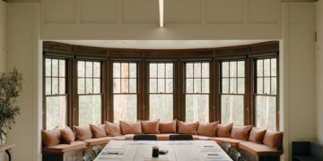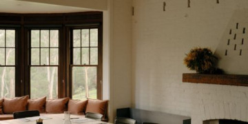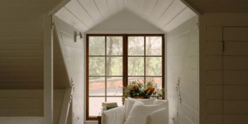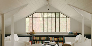 A picturesque Loft with private library and designer oversized white slip cover lounge chairs. The Dining Room features a commanding bluestone fireplace original wooden beams that blend seamlessly with the fresh white walls and contemporary furniture overlooking the pristine Harvest Garden. The European inspired Harvest Garden features a stylish chook pen, neutral woven Globe West outdoor furniture, a portable wooden bar atop white stones and surrounded by citrus trees and manicured lawns - ideal for hosting a variety of content production and bespoke events in a picturesque setting.