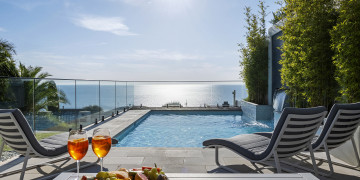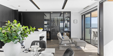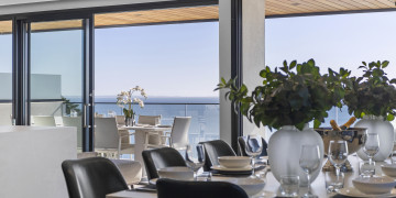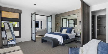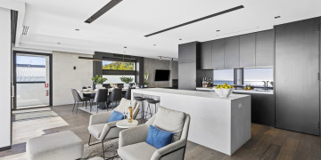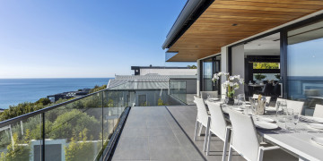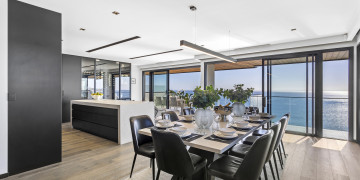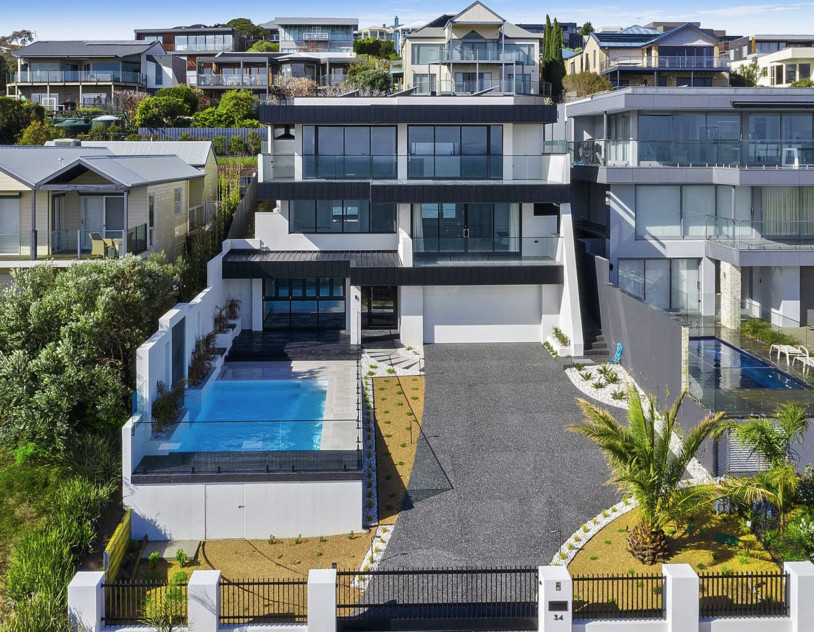 The six-bedroom home (flexible as 5–6 bedrooms, with configuration options of 6 king beds or 11+ singles) includes five bathrooms, a gourmet kitchen with butler’s pantry, multiple entertaining zones, and a home lift for ease of access. Expansive open-plan interiors spill out onto ocean-facing terraces, where a heated pool, BBQ, and fireplace create a refined yet relaxed coastal atmosphere.