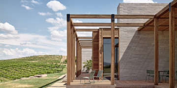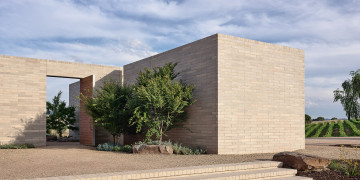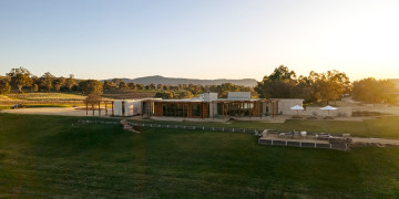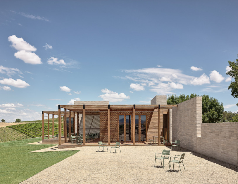 This architecturally designed, award winning cellar door and dining room is located on a historic winery with uninterrupted views of Mt Buller. The building is a group of pavilions linked to courtyards, terraces, and decks, utilising environmentally sustainable design principles and reflects the warmth and generosity of the owners. The blade walls extend into the landscape, with curated openings allowing glimpses through and across the building and surrounding vines. The entry is designed to respond to the scale and splendour of the mountain range.