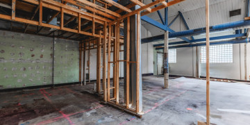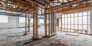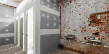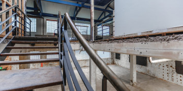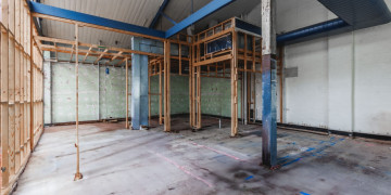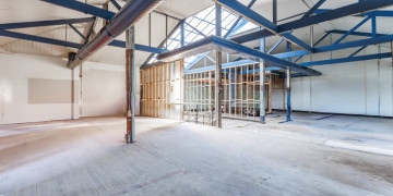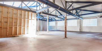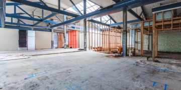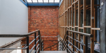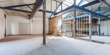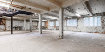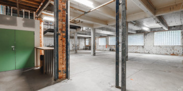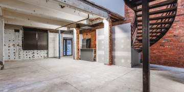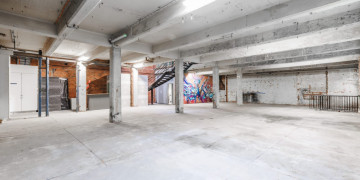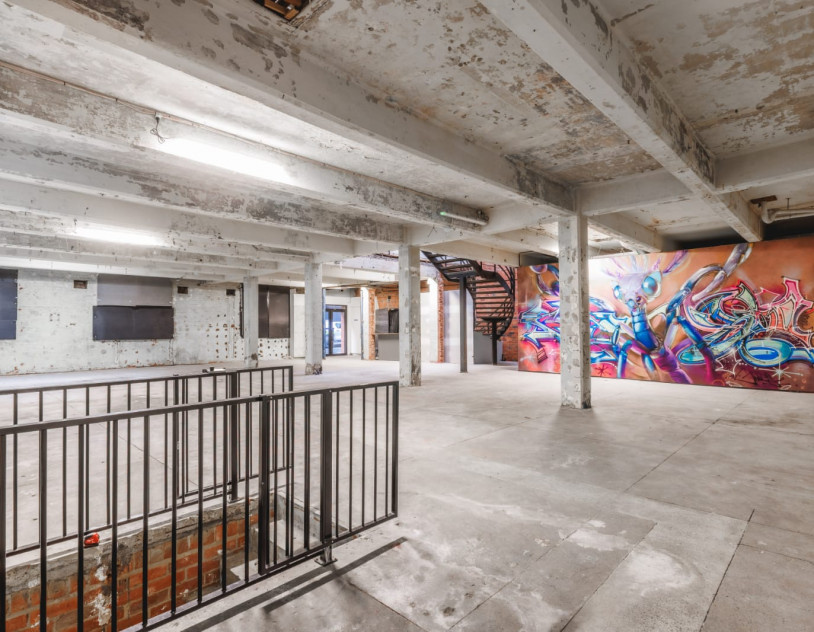 The ground level features exposed concrete columns, distressed brick walls, and industrial detailing throughout, including a feature graffiti mural that adds bold visual impact. The upper level boasts dramatic ceiling heights, steel-trussed beams, and ample floor space for creative staging, green rooms, or technical operations. A striking central atrium with a glass roof brings natural light into the stairwell and upper walkway, enhancing both form and function.