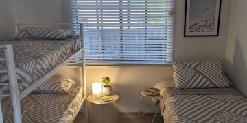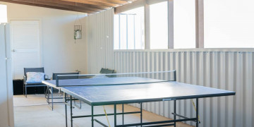 An expansive timber balcony with a slatted roof invites soft, filtered light and open-air shooting. Inside, the home is tastefully styled with comfortable accommodation for up to eight, anchored by a relaxed living area designed for both downtime and production use. Features include a curated selection of board games and books, table tennis and a Bluetooth sound system.