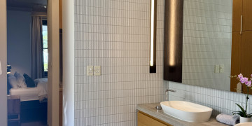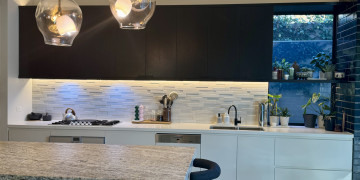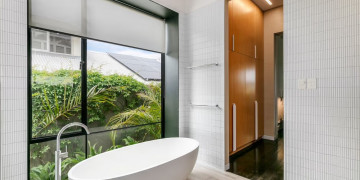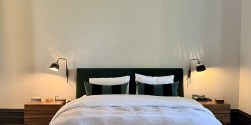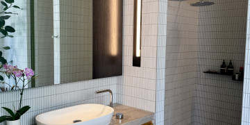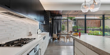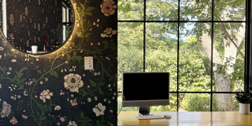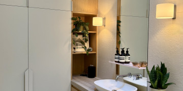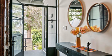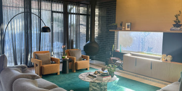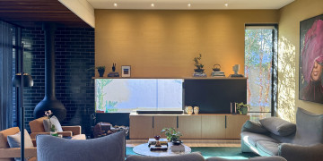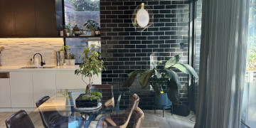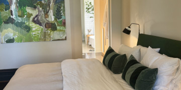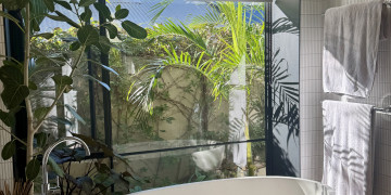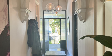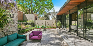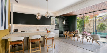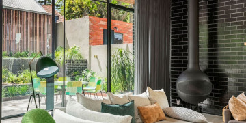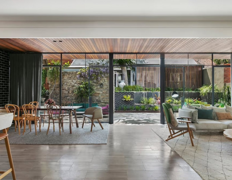 The primary bedroom suite is an oasis of calm, overlooking lush gardens with an adjoining contemporary bathroom designed to pull the outdoors in. Clean lines, expansive glazing, and a neutral palette throughout the newer extension transition the home into a bright, modern open-plan kitchen, dining, and living area, punctuated by imported pendant lighting and a floating fireplace. These interiors flow seamlessly into the enchanting wisteria-draped courtyard — offering a layered, textured outdoor backdrop perfect for lifestyle and fashion campaigns.