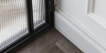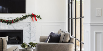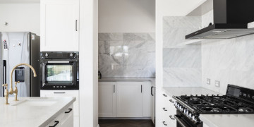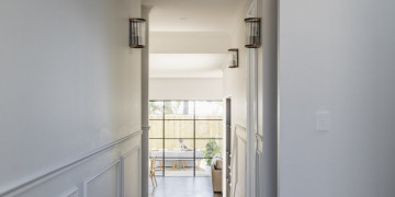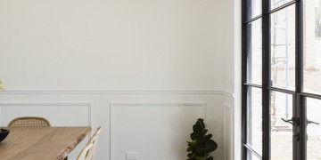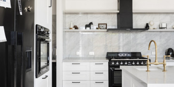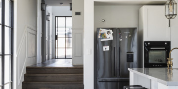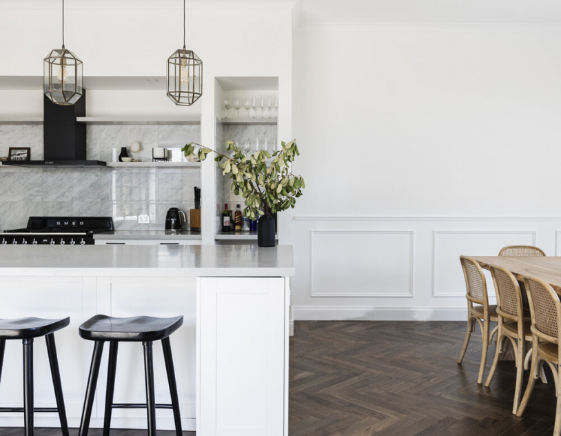 Inside, you'll find striking black steel-framed windows and fluted glass doors that flood each space with natural light. Herringbone timber floors lead through the expansive chef’s kitchen — complete with statement stone, brushed brass tapware, and integrated finishes — into a dining and living space made for understated entertaining.