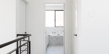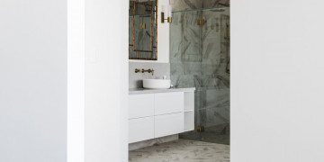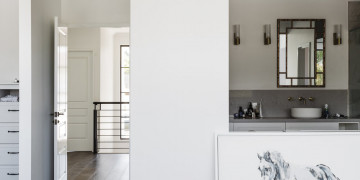 The bedrooms are soft and serene, with tonal palettes and layered textures, while the bathrooms feature marble surfaces, glass-walled showers, and curated vintage-style hardware.